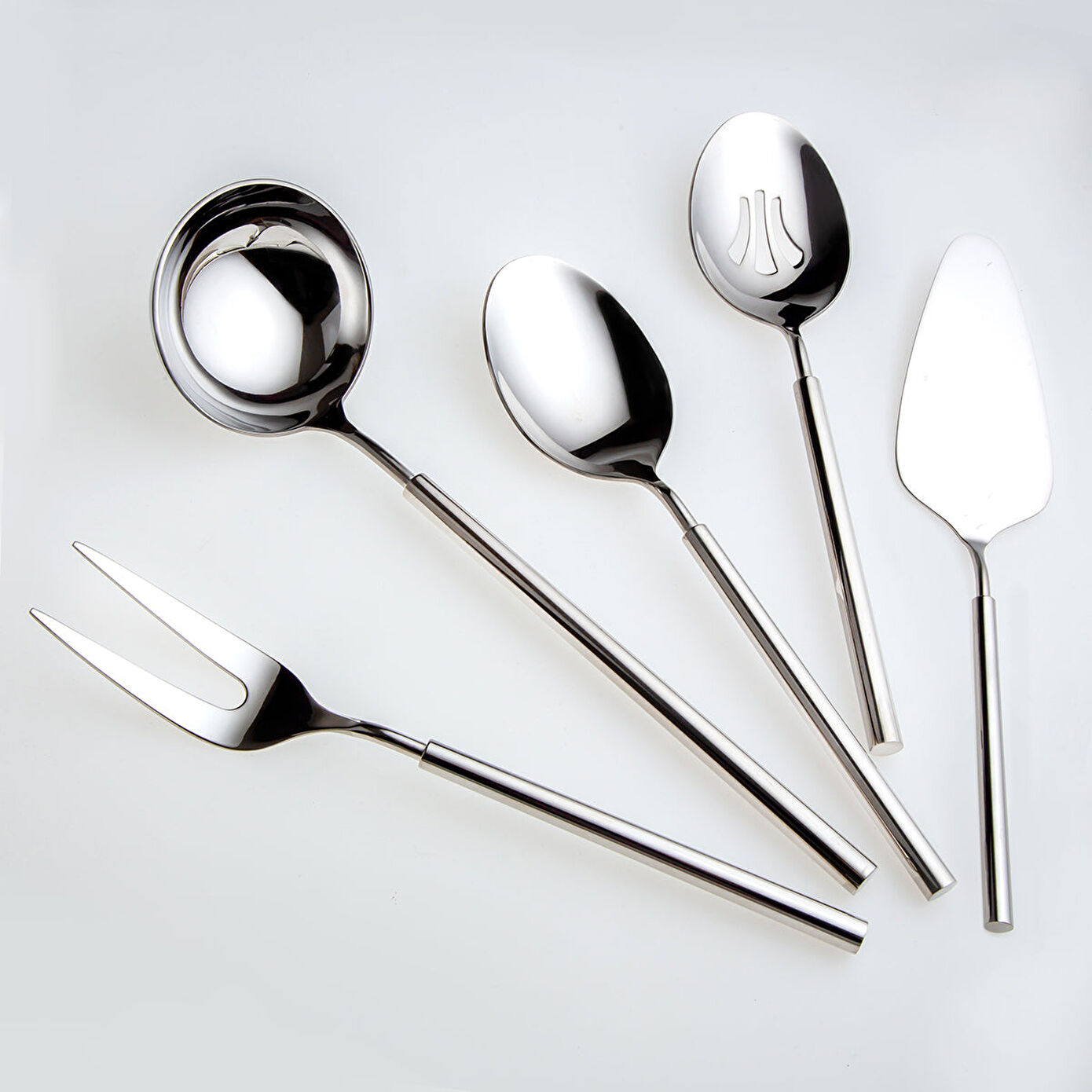 Jumbo 6000 Roller 5 parça servis setini temin ederek yemek servisi söz konusu olduğunda tüm ihtiyaçlarınızı eksiksiz bir biçimde giderebilirsiniz. Toplamda 5 parçadan oluşan bu setin içerisinde her bir ürün, üstün kaliteli Jumbo paslanmaz çeliğinden imal ediliyor. Set içerisinde servis çatalı, servis kaşığı, pasta küreği, çorba kepçesi ve yemek kevgiri olmak üzere 5 farklı parça yer alıyor. Servis çatalını steak ve benzeri et gruplarını servis ederken kullanarak etin parçalanmadan tabaklara yerleştirilmesini sağlayabilir, servis kaşığından faydalanarak ise salatadan mezeye pek çok farklı yiyeceği eşit bir biçimde tabaklara dağıtabilirsiniz. Pasta ve benzeri tatlıları ve hamur işlerini servis etmek için pasta küreğinin işlevselliğinden yararlanabilirsiniz. Elbette çorbalarınızı ve sulu yemeklerinizi servis etmenize yarayacak çorba kepçesi ve diğer yemek çeşitlerinin sunumunu yaparken size kolaylık sağlayacak kevgir de bu setin olmazsa olmazları arasında yer alıyor.