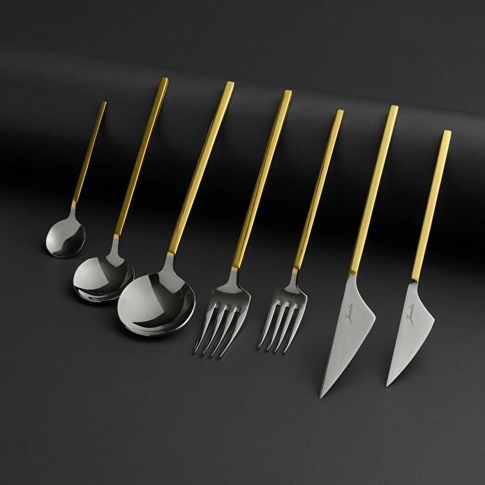Geleneksel olarak tek renk olarak gümüş renkte üretilmesi tercih edilen çatal kaşık bıçak takımları, Jumbo 9100 altın çatal kaşık bıçak takımı ile bambaşka bir boyut kazanıyor. Hem gold hem silver tonların bir araya geldiği bu olağandışı tasarım, sofralara yerleştirildiği andan itibaren tüm konukları kendisine hayran bırakmayı garantiliyor. Üstelik form olarak köşeli ve kareli hatlara sahip olduğu için şekil itibariyle de klasik çatal kaşık bıçak takımlarına meydan okumayı başarıyor. Kısacası eşi benzeri olmayan bu takım, en modern sofraların baş tacı olmaya şimdiden aday.