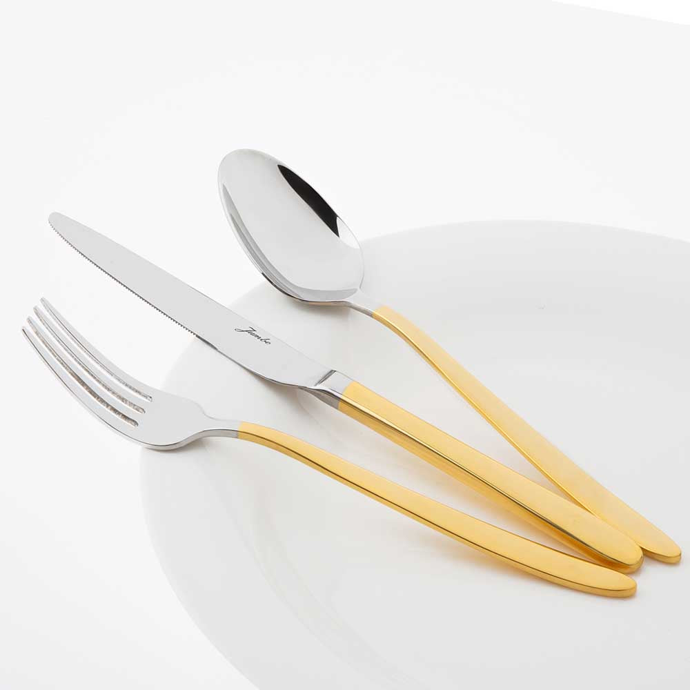 Jumbo 9400 altın çatal kaşık bıçak takımı, öncelikle hem gümüş hem altın renklerin bir arada kullanıldığı çağının ötesinde tasarımıyla dikkatleri üzerine çekiyor. Geleneksel olarak sadece silver renkte üretilmesi kabul görmüş çatal kaşık bıçak takımlarıyla yepyeni bir bakış açısı getiren bu set, yuvarlak ve yumuşak hatlarıyla da klasik takımlara göz kırpıyor. Toplamda 12 kişilik geniş kapasitesi ve 84 parçasıyla geniş ailelerin tüketim ihtiyaçlarını fazlasıyla karşılayabilecek olan bu set, çeyiz hediyesi ya da düğün armağanı olarak da tercih edilebilir.