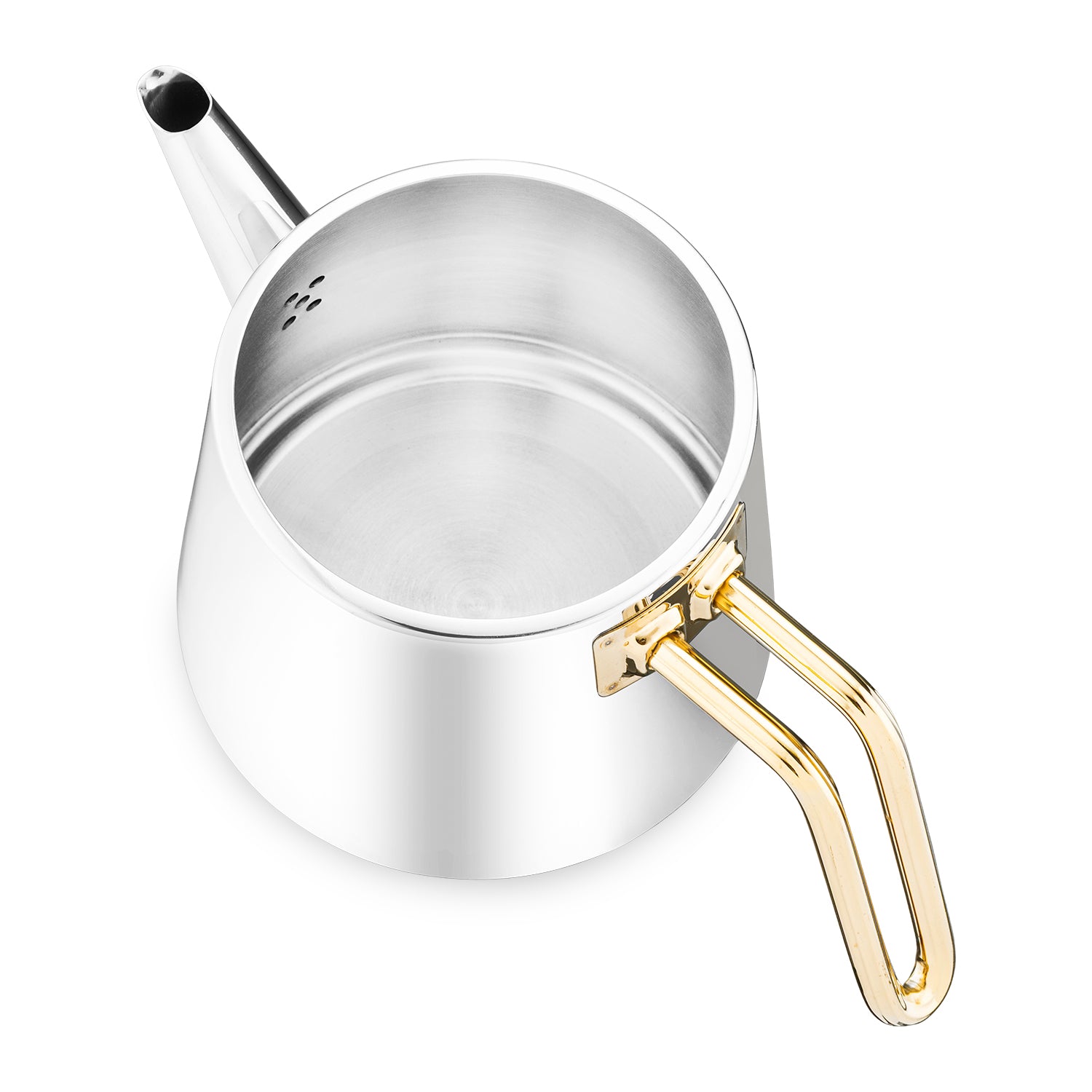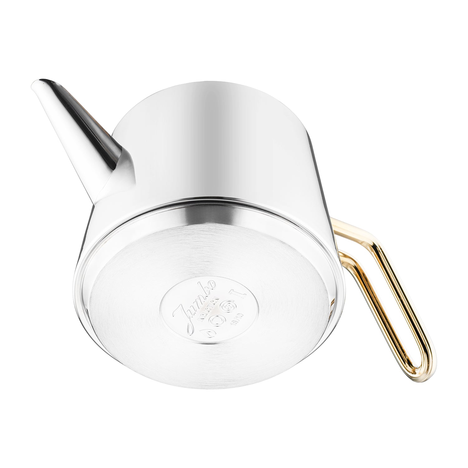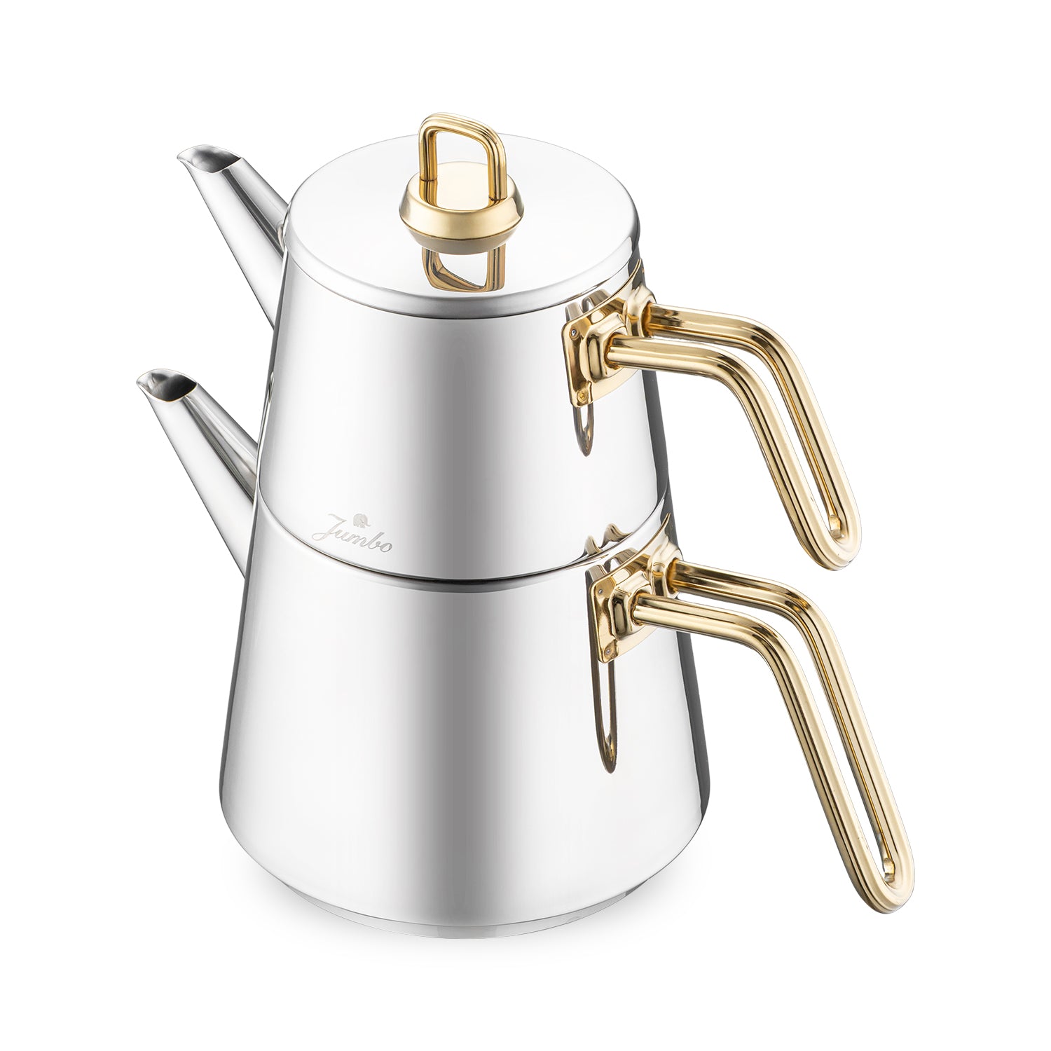 Tasarımıyla ön plana çıkan Jumbo gold çaydanlık, sade bir tasarıma sahip olsa da ilgi çekici detaylarla donatıldı. Parlak titanyum yüzeylere sahip olan ürün, paslanmaz çelik materyal sayesinde de son derece dayanıklı. Yıllara meydan okuyan bu model sayesinde siz de Jumbo kalitesinin keyfini uzun yıllar çıkarabilirsiniz. Tutma kolaylığı sağlayan kapak kulpu da bu çaydanlıkla ilgili sevilen özelliklerden. Hem kapakta hem de yan kulplarda bulunan altın detaylar ise modelin imza özellikleri arasında yer alıyor. Simetrik olarak tasarlanan bu çaydanlık kullanım esnasında pratiklik sağlıyor. Ayrıca emzik tasarımında da simetrik olan Jumbo Doha, çay doldururken dökülme riskini de ortadan kaldırıyor. Siz de mutfağınıza çok yakışacak bu ürünü seçerek şık sunumlar yapabilirsiniz. Misafirlerinizi kolayca etkileyecek olan Jumbo titanyum gold çaydanlık, ergonomik kullanımı sayesinde de sizi oldukça memnun edecek.