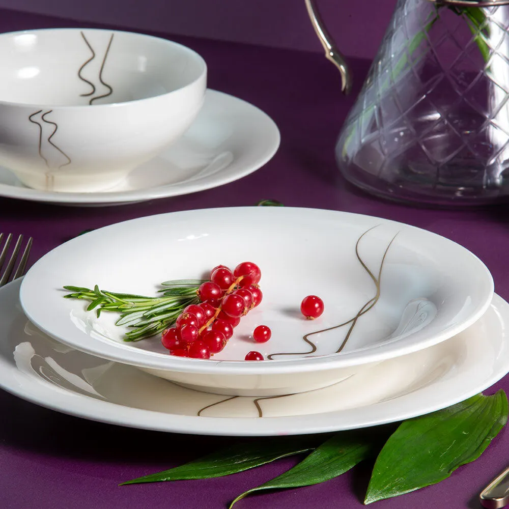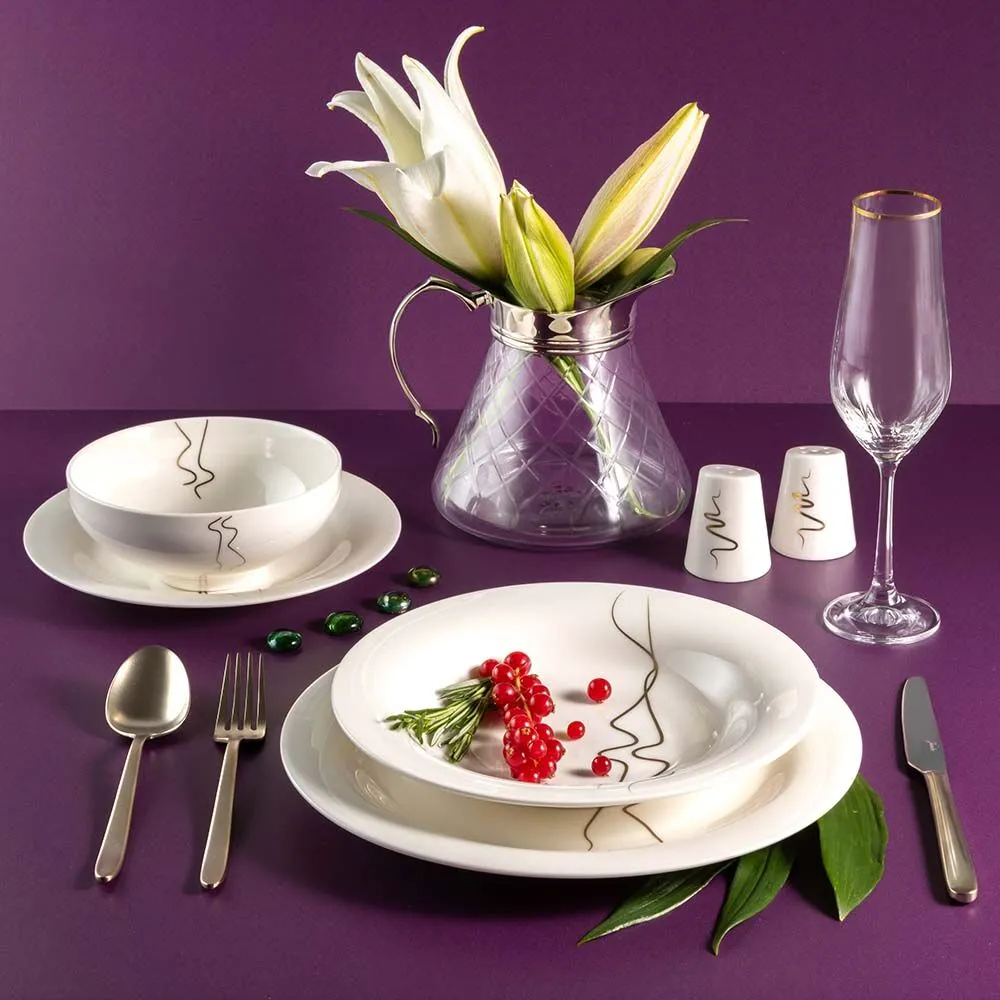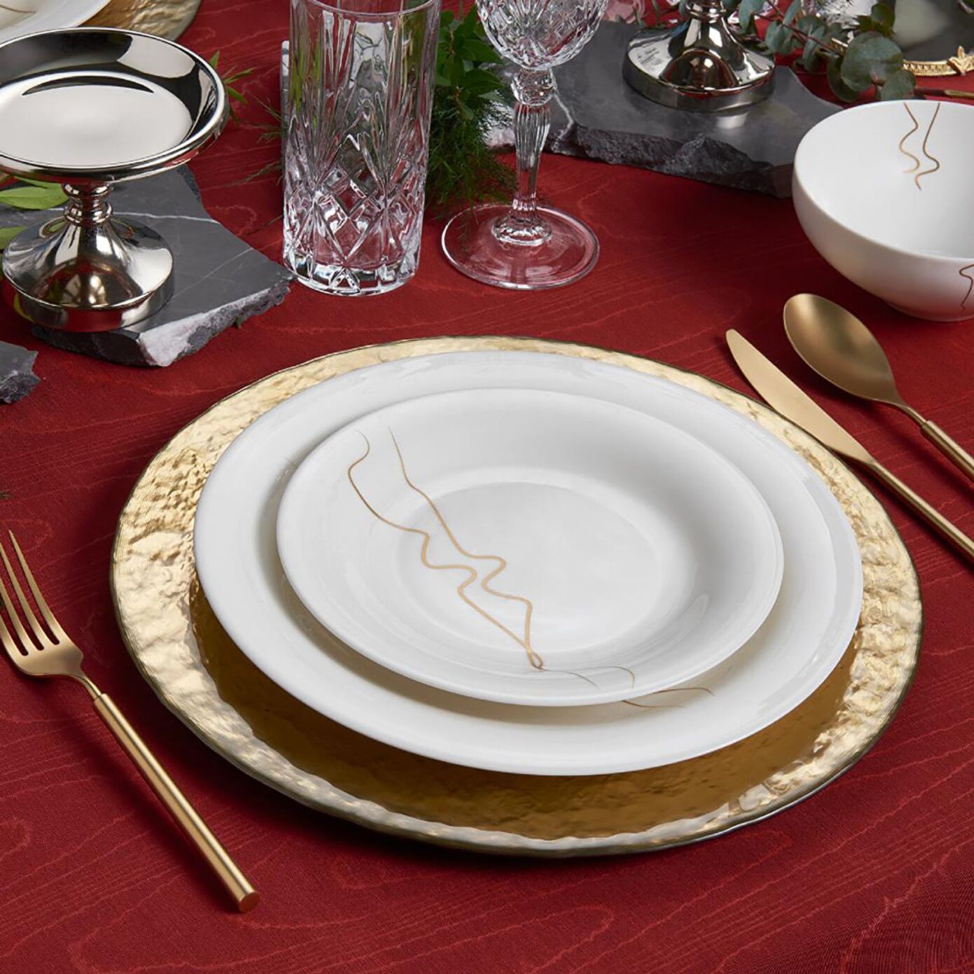 İlk bakışta dikkat çekici sofralar kurmak ve misafirlerinizi mest etmek istiyorsanız, Jumbo Efect 12 kişilik yemek takımı tam size göre. Tamamen minimal ve sade tasarımlardan yana değilseniz, ancak fazla gösterişten ve abartıdan da hoşlanmıyorsanız, bu yemek takımı tam size göre olabilir. Yemek takımlarının vazgeçilmez rengi olan beyaz renk ile şekillenmiş olan bu tasarımın sol tarafında minimalist gold çizgilerin bulunduğu şık bir detay yer alıyor. Aynı anda hem modern hem de vintage bir hava verebilen bu benzersiz yemek takımı, özellikle gold detayların hakim olduğu diğer sunum gereçleri ile mükemmel bir uyum oluşturmayı garantiliyor. Eğer sizin de mutfağınızda ağırlıklı olarak altın veya yaldızlı detaylar hakimse, eski yemek takımınızı hemen bu takım ile yenileyerek sofralarınıza tazelik getirebilirsiniz.