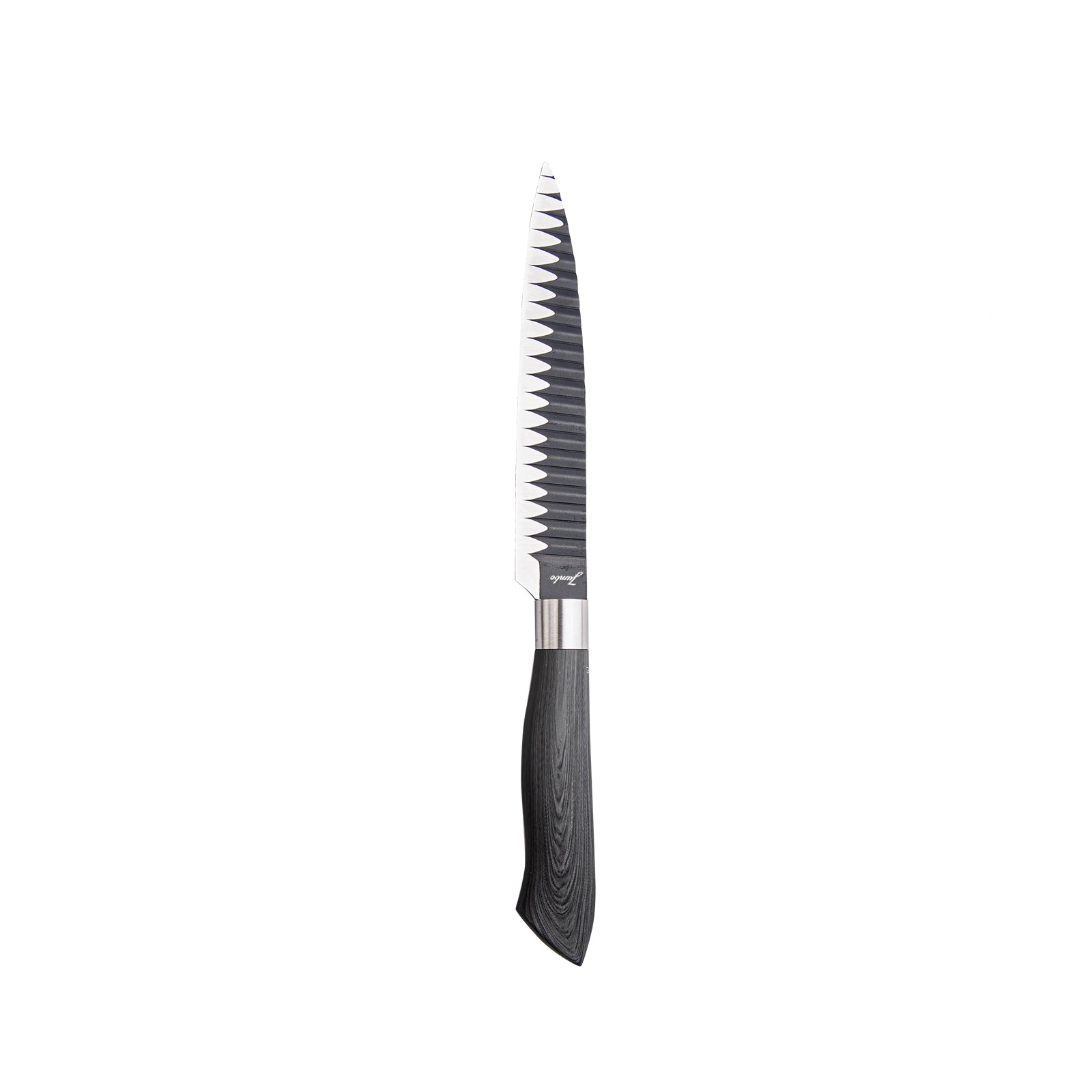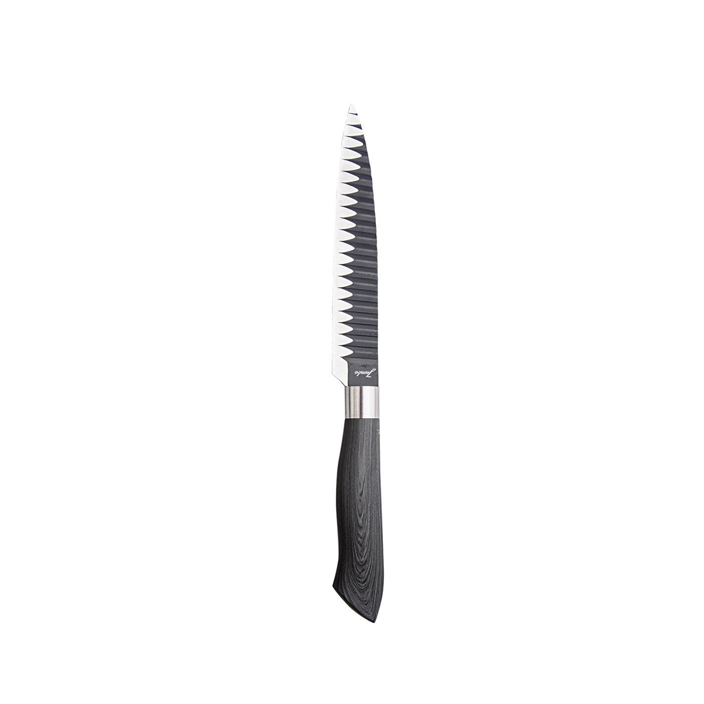 Jumbo Eva 5 parça bıçak seti mutfakların vazgeçilmez parçaları arasında yer alıyor. Çok yönlü özelliği sayesinde sebze doğramaktan et dilimlemeye kadar tüm ihtiyaçlarda kullanılabiliyor. 5 farklı özelliğe sahip bıçaklara sahip olan bu bıçak seti; şef bıçağı, dilimleme bıçağı, ekmek bıçağı, doğrama bıçağı ve soyma bıçağından oluşuyor. Şef, et ve ekmek bıçağı 1,8 mm kalınlığa soyma bıçağı ise 1,2 mm kalınlığı sayesinde yiyeceklerin yapısına uyum sağlayabiliyor. Kabartmalı çelik gövdeden üretilen bu bıçaklar herhangi bir yiyeceği keserken ya da soyarken bıçağın kaymasını önlüyor. Böylece güvenli bir kullanım alanı yaratıyor. Her açıdan kullanımı kolaylaştıran bu bıçak seti, farklı boyutları ile de doğrayacağınız gıdaya göre de uygun bıçağı tercih etmenize yardımcı oluyor. Siz de fonksiyonel kullanımı ile öne çıkan Jumbo Eva bıçak setini tercih ederek rahat ve pratik kullanımın tadını çıkarabilirsiniz.