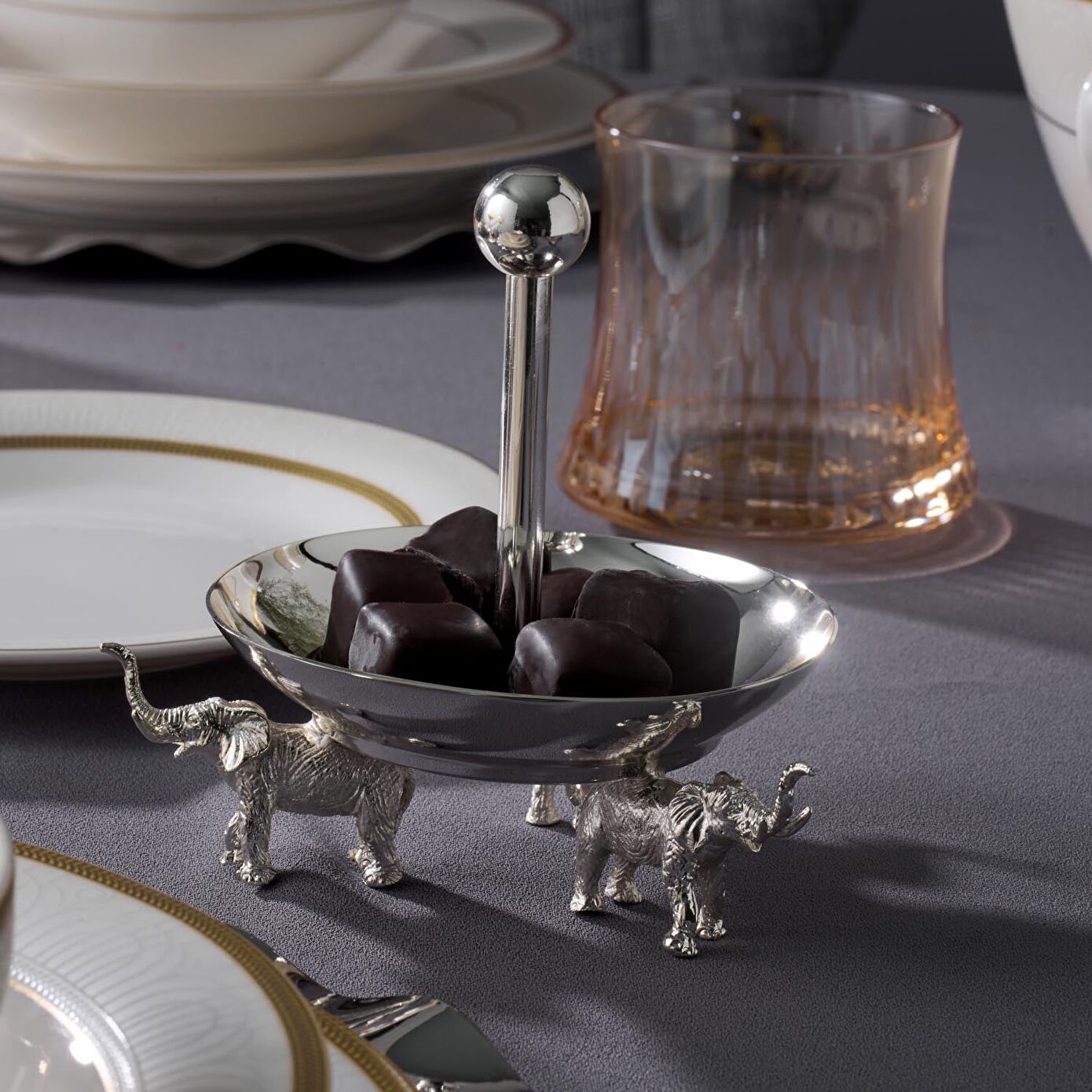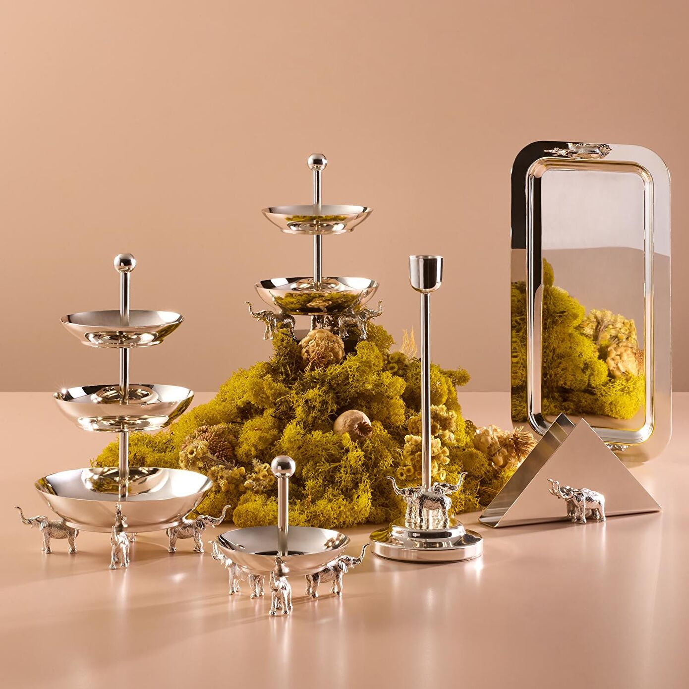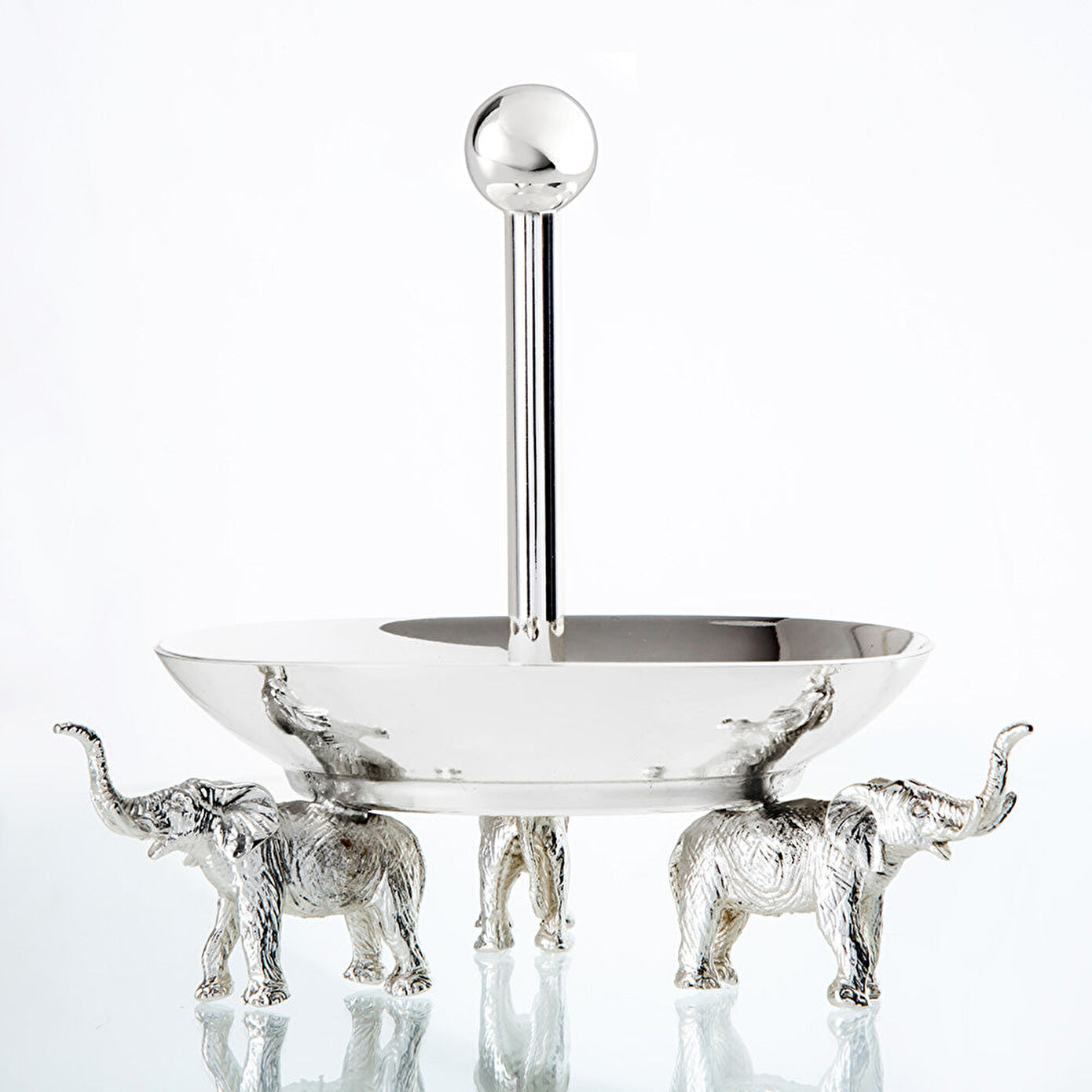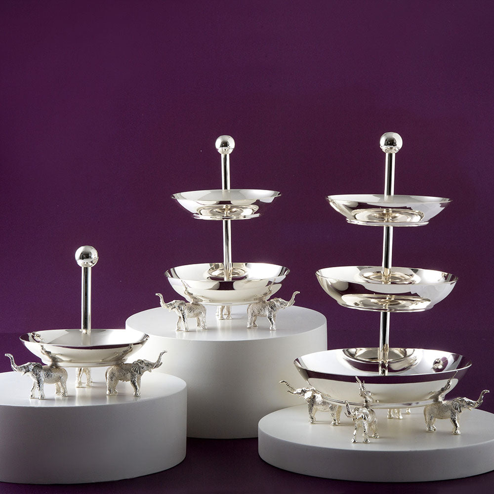 Jumbo fil ayaklı sunumluklar, üstün kaliteli pirinç malzemeden özenle üretilmiş ve zarif gümüş kaplama ile İşlenmiştir.