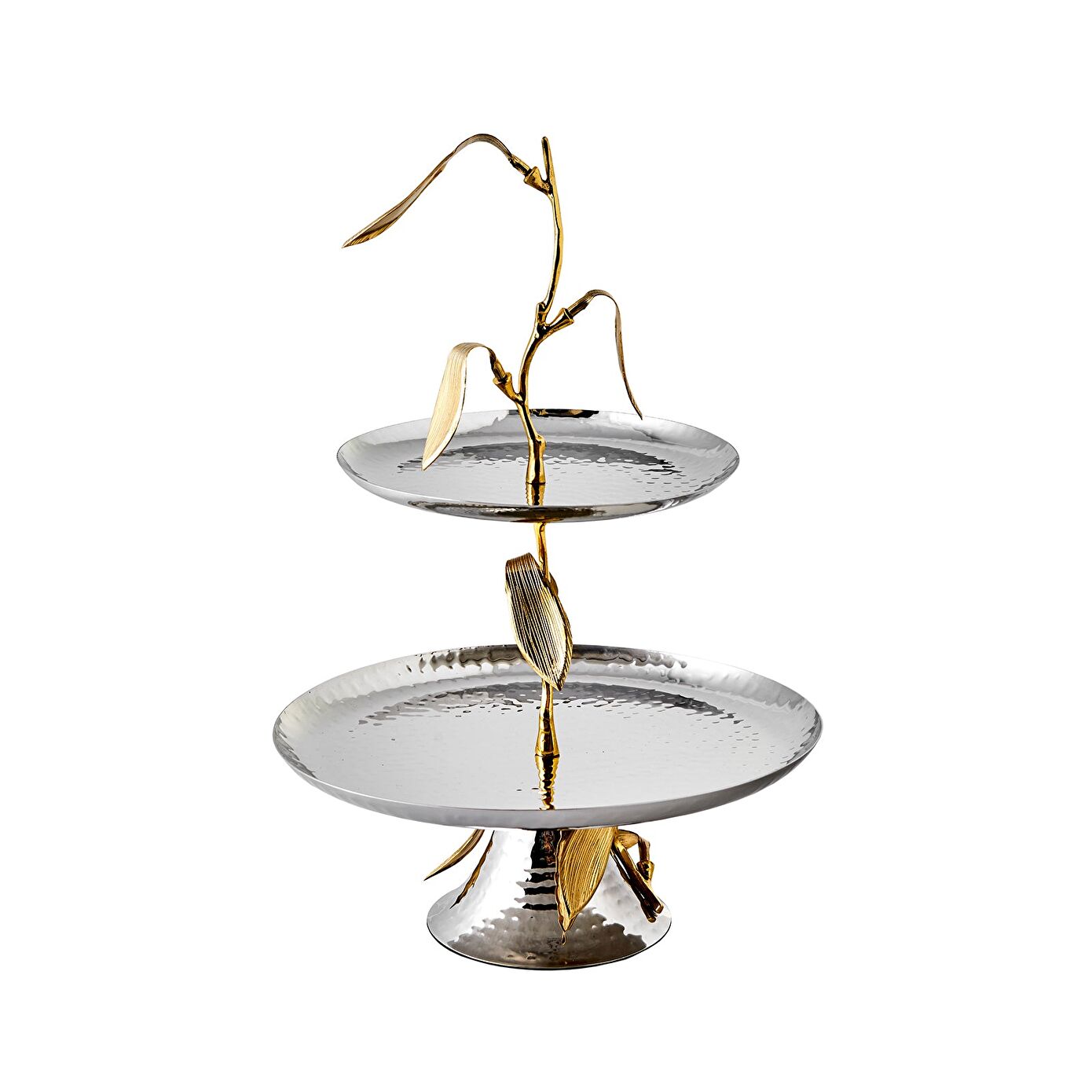 İki katlı sunumlukların revaçta olduğu günümüzde Jumbo Leaf 2 katlı servislik, kendine has tasarımını ve özgün yapısını ön plana çıkartarak adından söz ettirmeyi başarıyor. Çift katlı yapısı sayesinde oldukça geniş bir kapasite sunan bu ürün, ikramlarınızı, atıştırmalıklarınızı ve aperatiflerinizi sunmanın en şık yollarından birini oluşturuyor. Bu ürünün zarif tasarımı, her iki katı birbirine bağlayan gold detaylı ağaç dalı dizaynıyla adeta şahlanıyor. Böylece gold ve silver tonları bu üründe bir arada kullanılarak ortaya harika bir karma tasarım çıkıyor. Yine paslanmaz çelikten üretilen ve biri küçük biri büyük iki servis tabağına birbirine bağlama görevi üstlenen gold sap parçası, şık yaprak detaylarıyla bezenerek servisliği doğal bir görünüme kavuşturuyor. Her bir ayrıntısı ince düşünülmüş ve hesaplanmış olan bu harika servisliğe siz de hemen şimdi Jumbo farkıyla sahip olabilir ve sunumlarınızda gönül rahatlığıyla kullanabilirsiniz.