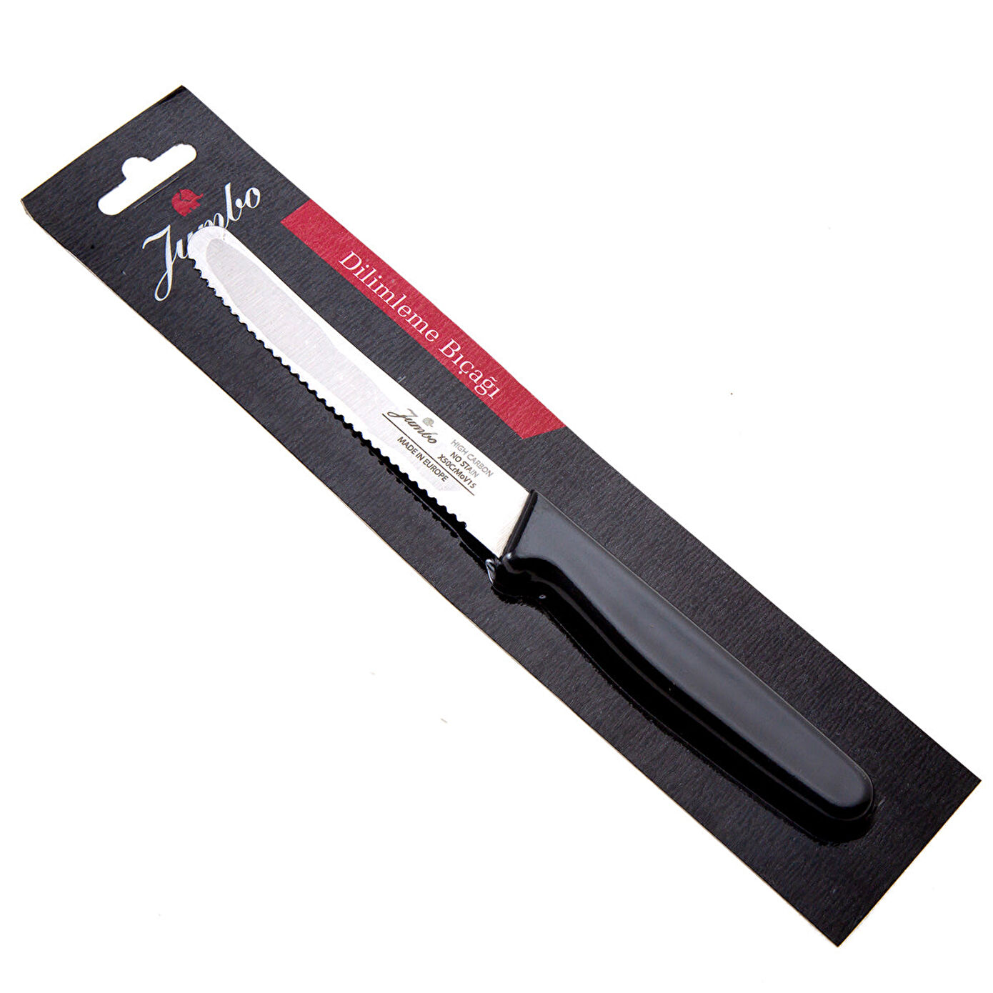 Jumbo Practico 11 cm dilimleme bıçağı, öncelikli olarak 4116 Alman çeliğinden imal ediliyor. Bu üstün dayanıklı malzeme sayesinde ürün, dayanıklılığını en üst seviyeye çıkartarak bıçakları korkulu rüyası korozyon ve paslanmayı tarihe karıştırıyor. Bıçağın ergonomik ve perçinli sapı, kullanımını çabasız ve pratik hale getiriyor. Daha pek çok etkileyici özelliğe sahip olan Jumbo Practico siyah dilimleme bıçağı, Jumbo ayrıcalıkları ve kalitesiyle burada beğeninize sunuluyor. Siz de hemen şimdi bu benzersiz ürünü yakından inceleyebilir ve satın alabilirsiniz. Diğer bıçak seti modellerimizi incelemek ve Jumbo ayrıcalıklarından faydalanmak için hemen Bıçak Seti kategorimizi ziyaret edebilirsiniz.