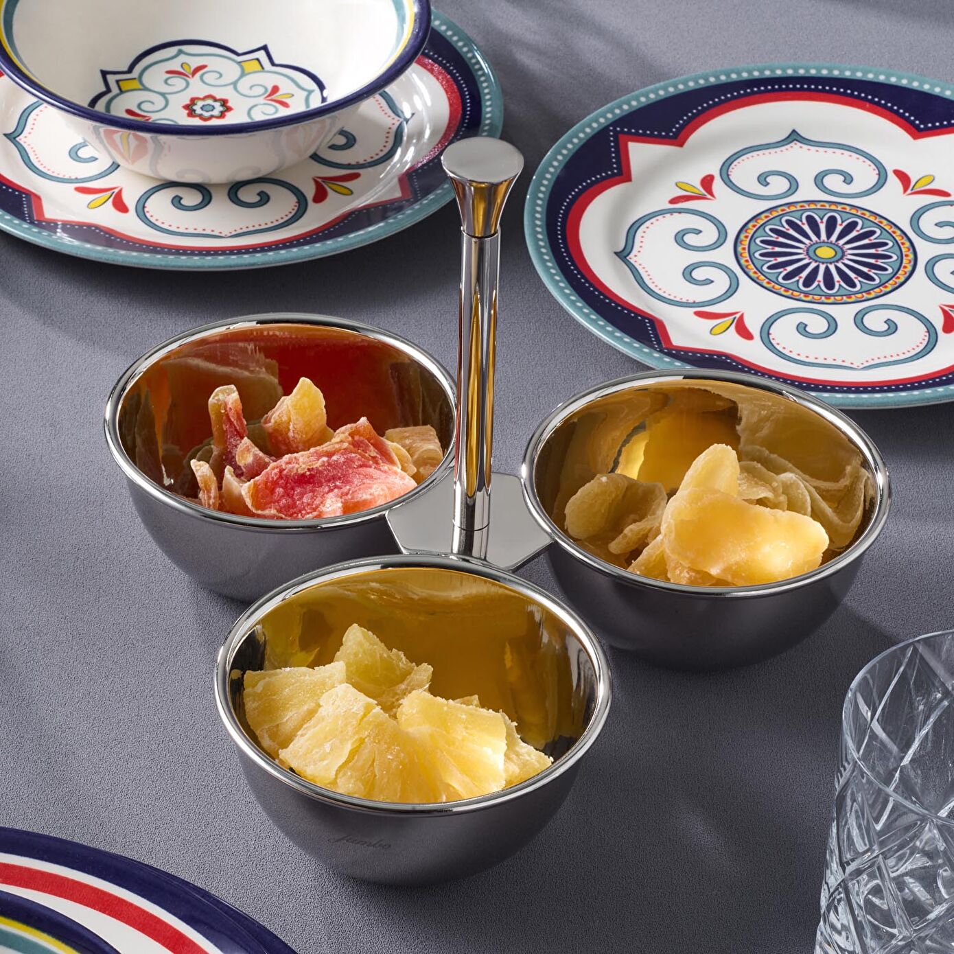 Göz alıcı atıştırmalıklar sunmak için ihtiyacınız olan tek şey Jumbo Quenny 3'lü çerezlik! Benzersiz tasarımıyla beğenileri toplayan Jumbo nikel kaplama çerezlik tek parça olup üç bölmeden oluşuyor. Sunumlarınız şıklık ve zarafet katan bu çerezlik modeli, yüksek kaliteye sahip nikelden üretiliyor. Siz de hemen şimdi bu ürünü yakından inceleyerek ikramlarınızı en şık şekilde servis etmenin keyfini yaşayabilirsiniz.