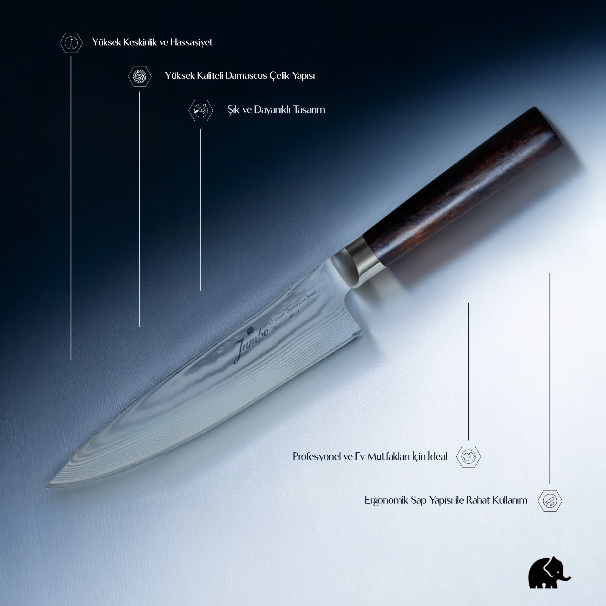 Jumbo Saga Çelik'in özenle tasarlanmış Damascus Bıçak Seti, profesyonel mutfak kullanımının yanı sıra şefler ve yemek tutkunları için mükemmel bir tercihtir. Set, yüksek kaliteli malzemeler ve titiz işçilikle üretilmiştir. Her bir bıçak, dayanıklılık ve keskinlik arayan kullanıcılara uzun ömürlü performans sunar.