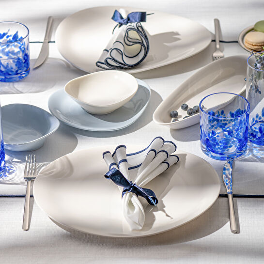 - 1 Adet Beyaz Oval Tabak (28,2 cm): Beyaz oval tabak, ufka yayılan deniz köpüklerini anımsatan bir tasarıma sahiptir.